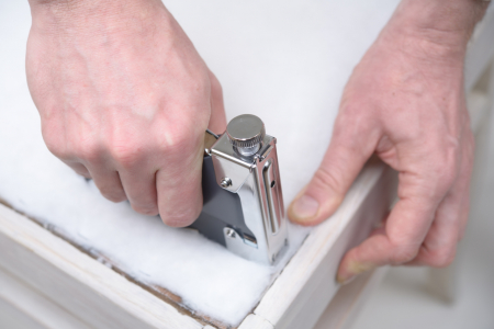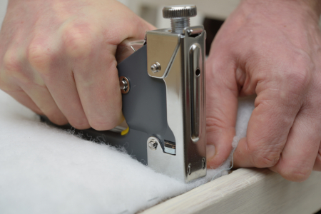 - bílá textilie s gramáží 20, nebo 30 g/m2 – slouží k přidržení molitanové výplně čalounění na místě, následně je překrytá svrchní potahovou textilií.