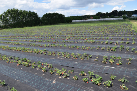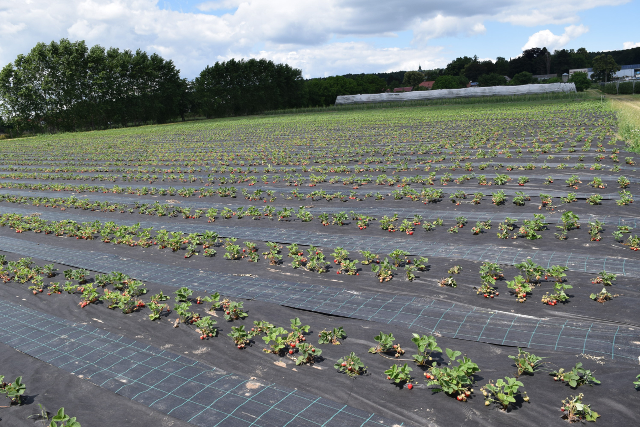 Kombinované využití tkané (čtverečkovaná) a netkané textilie při pěstování jahod v Holovousích.