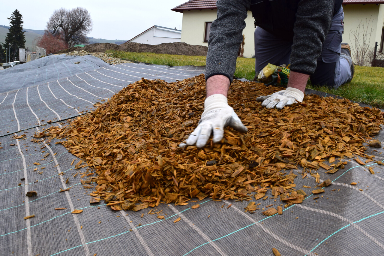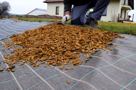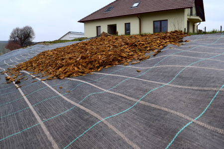 Svahová agrotextilie je polypropylenová tkanina s nízkou propustností světla a vysokou UV stabilizací, která omezuje posuv dřevního mulče dolů ze svahu především během dešťů.