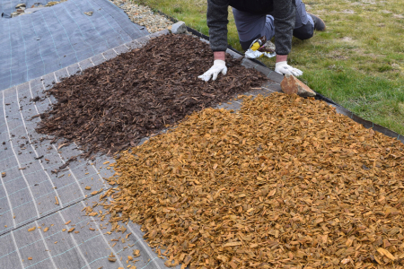 Používejte pouze dřevní mulč, například dřevní štěpku nebo kůru. Dřevní mulče se zachytí o vlákna v páscích příze DREF, které tak omezují posunutí mulče dolů ze svahu - to neplatí pro jiné druhy mulče, jako je kamenivo.